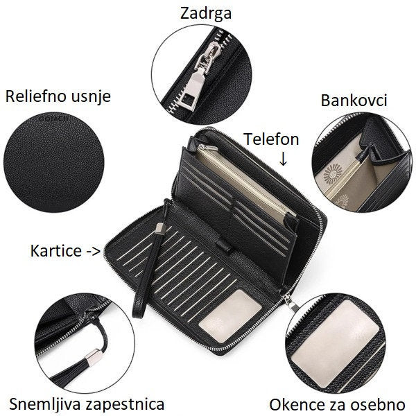 Prostora bo za denar, ki ga nebo potrebno prepogniti, veliko je žepkov za kartice, potem je tu notranji predal za drobiž, kakšno šminko in še in še.