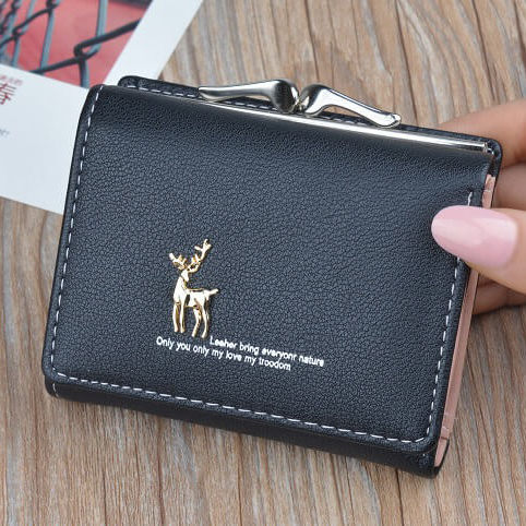 Ženska denarnica Mia je manjše in kompaktna denarnica, odlična za vse dame, ki nosijo s sabo le najnujnejše stvari. Polepša jo srnjak, ki je zlate barve in denarnici doda modni izgled.